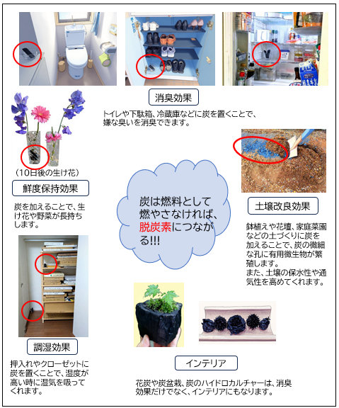 このため、炭を燃料として使用するのではなく、暮らしの中に取り入れるとこで、結果的に大気中のCO2を減らすこと(脱炭素)ができます。炭には様々な効能があるので、炭を暮らしの中に取り入れることで生活が豊かになり、合わせて、脱炭素を通じて地球温暖化問題対策に寄与できるわけです。