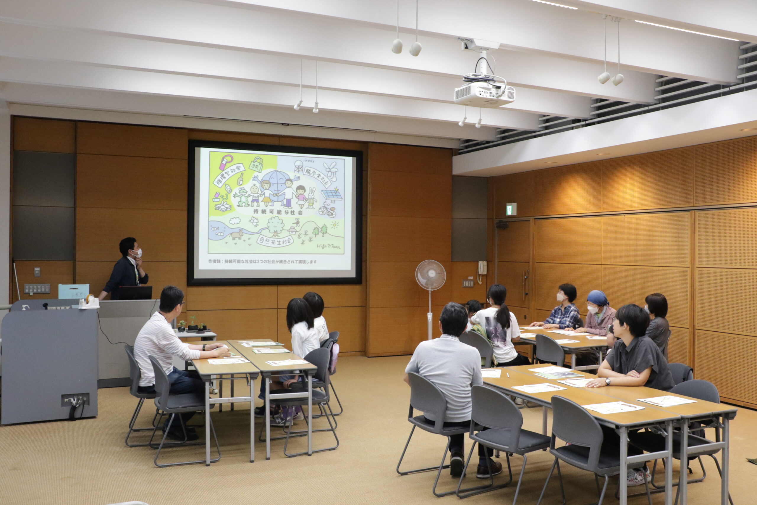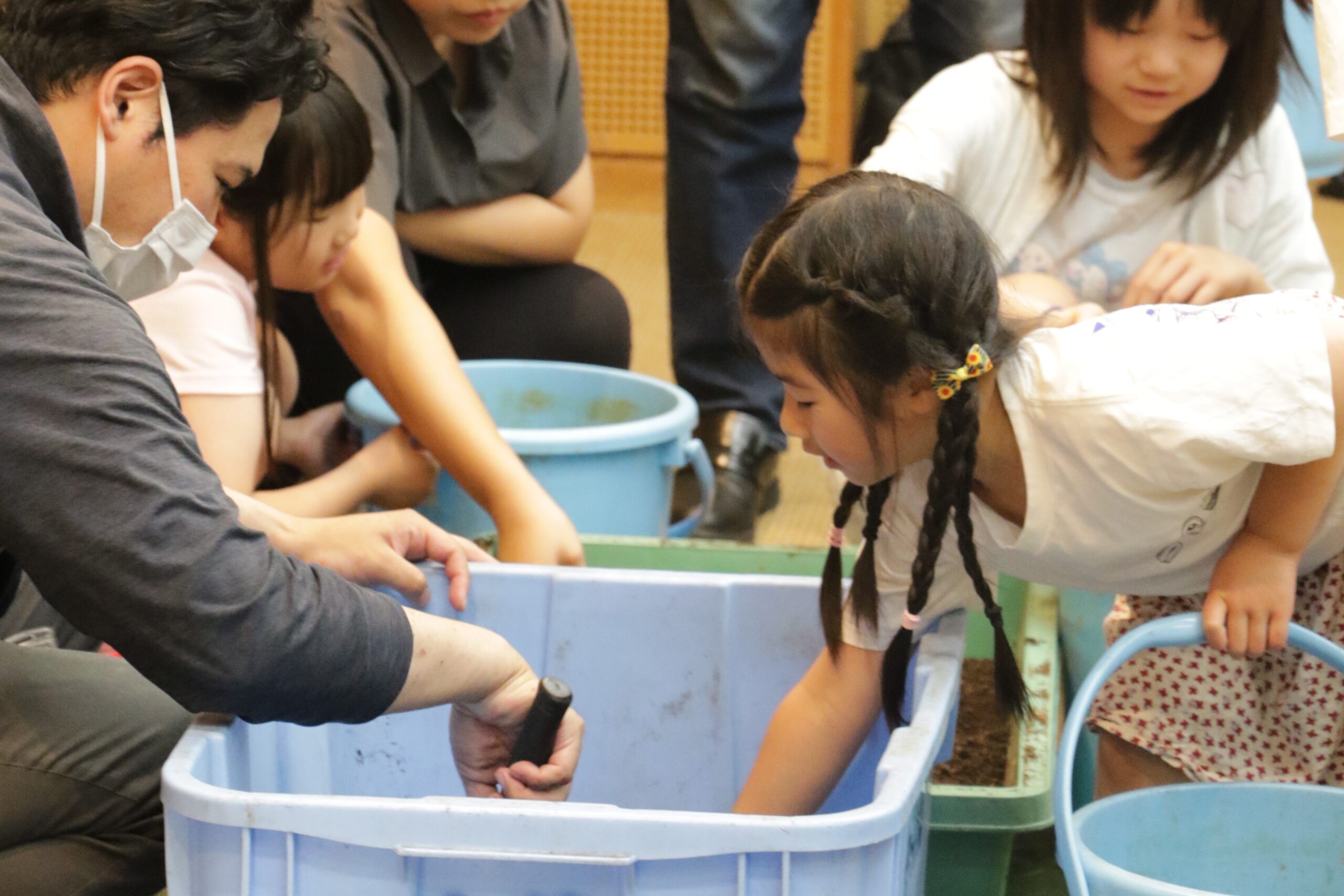 | ①イベント趣旨説明の様子 | ②コンポストの基材作り説明の様子 |